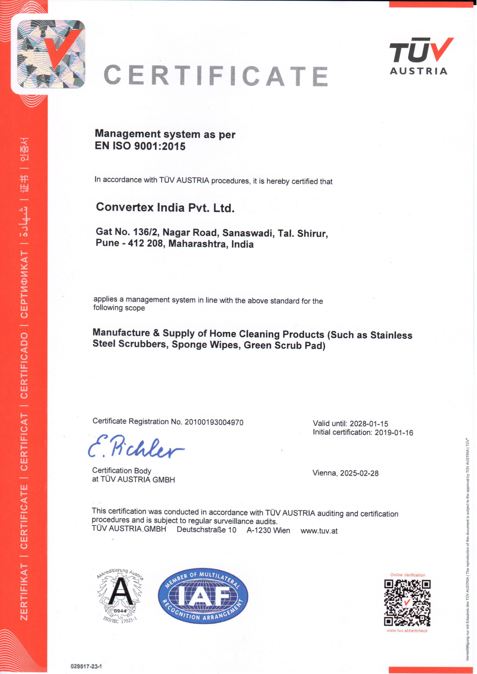As India’s leading manufacturer of steel scrubbers and a wide range of home cleaning products, we uphold international quality standards. Convertex India Pvt. Ltd. is TUV Austria ISO certified, underscoring our commitment to delivering superior products and services on a global scale.